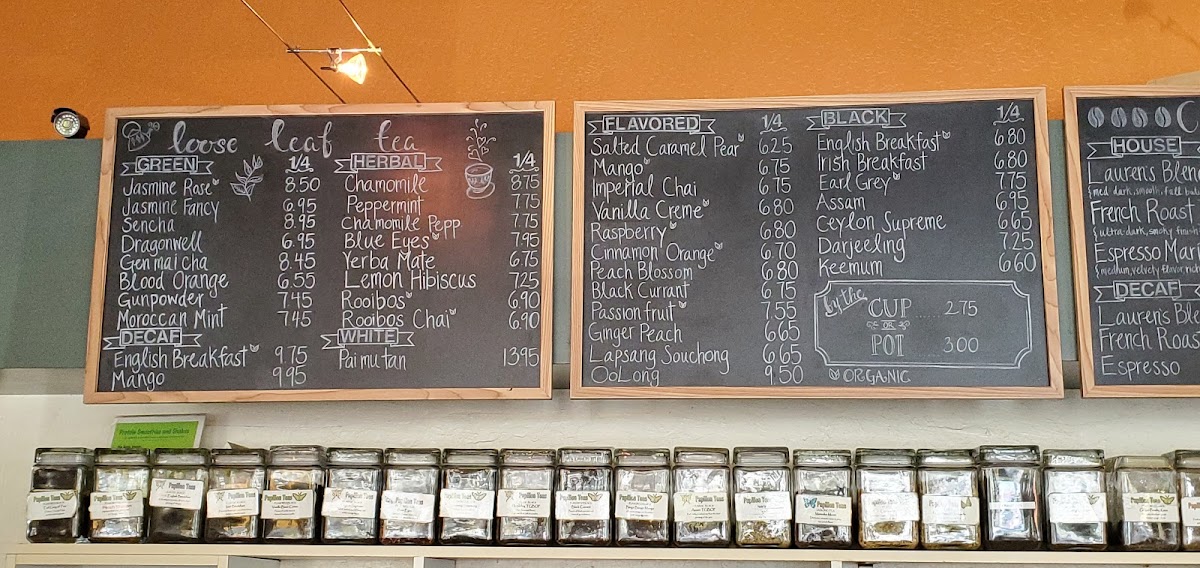 Black Tea, Green Tea, Midnight Mango Tea, Blue Eyes (caffeine free) Tea