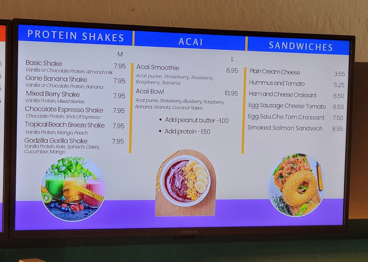 Peanut butter, banana, 24 grams chocolate protein, fresh spinach, fresh kale, organic acai, lactose-free smoothie mix